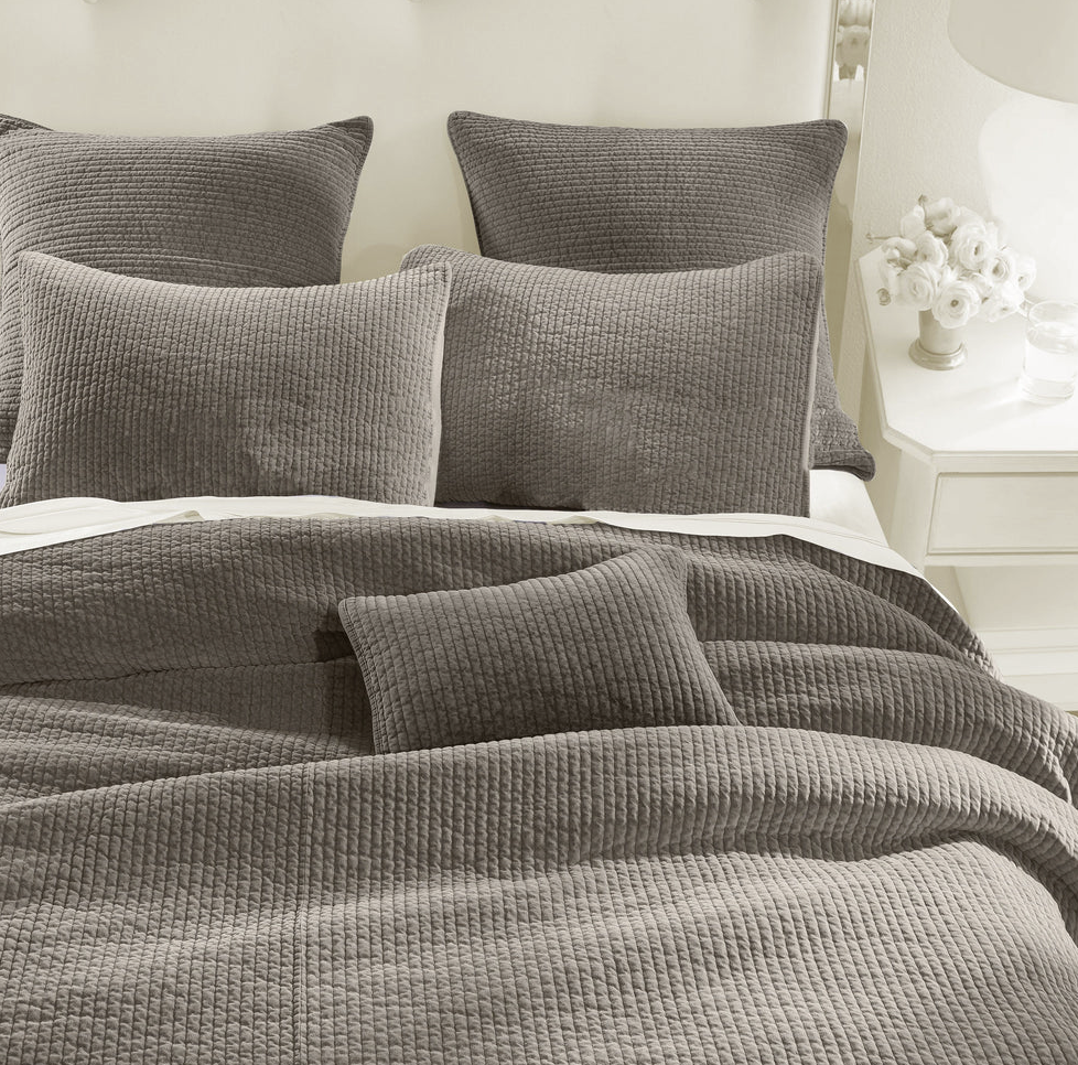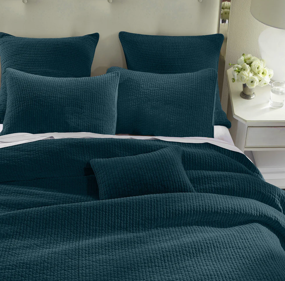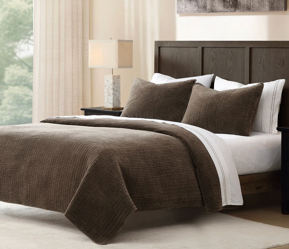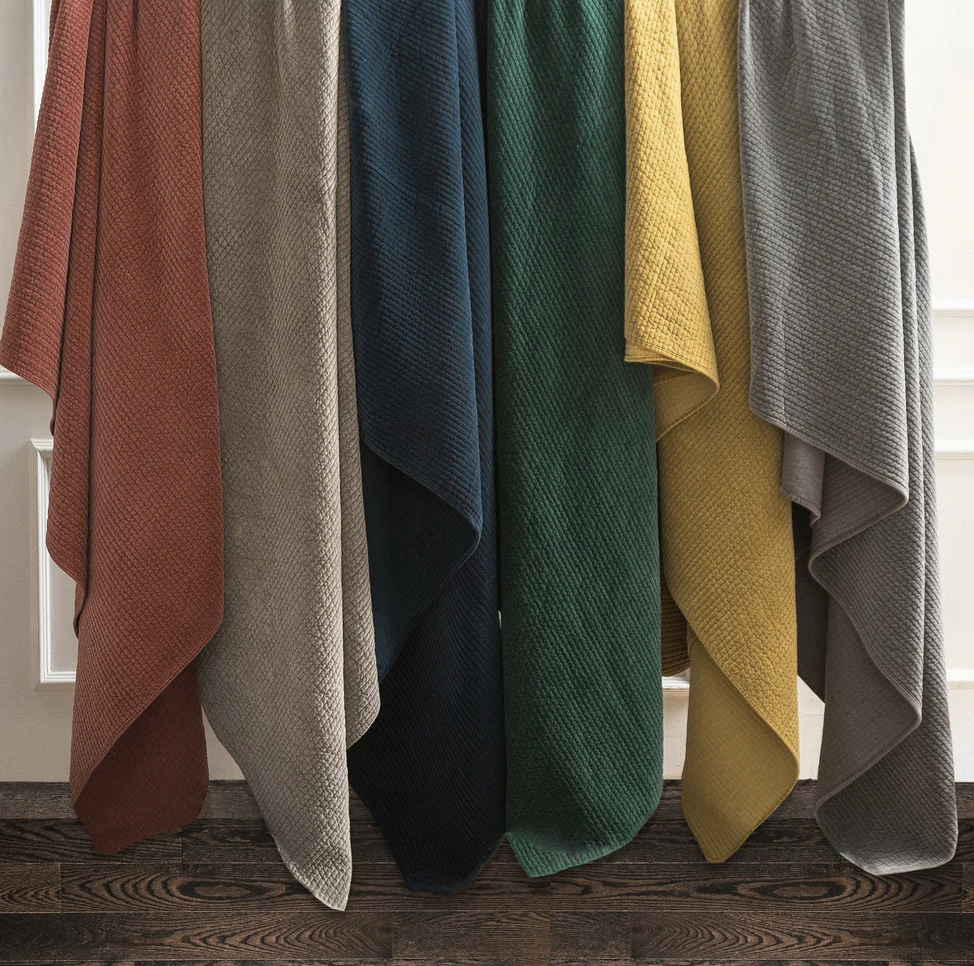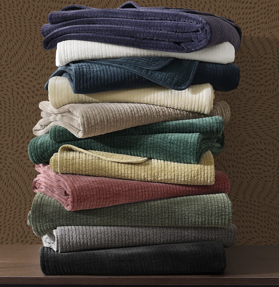 - Colcha de terciopelo deslavado en 100% algodón con acolchado acanalado moderno. Suave y resistente, ideal como pieza ligera en verano o complemento abrigador en invierno. Disponible en diversos tonos neutros y brillantes.